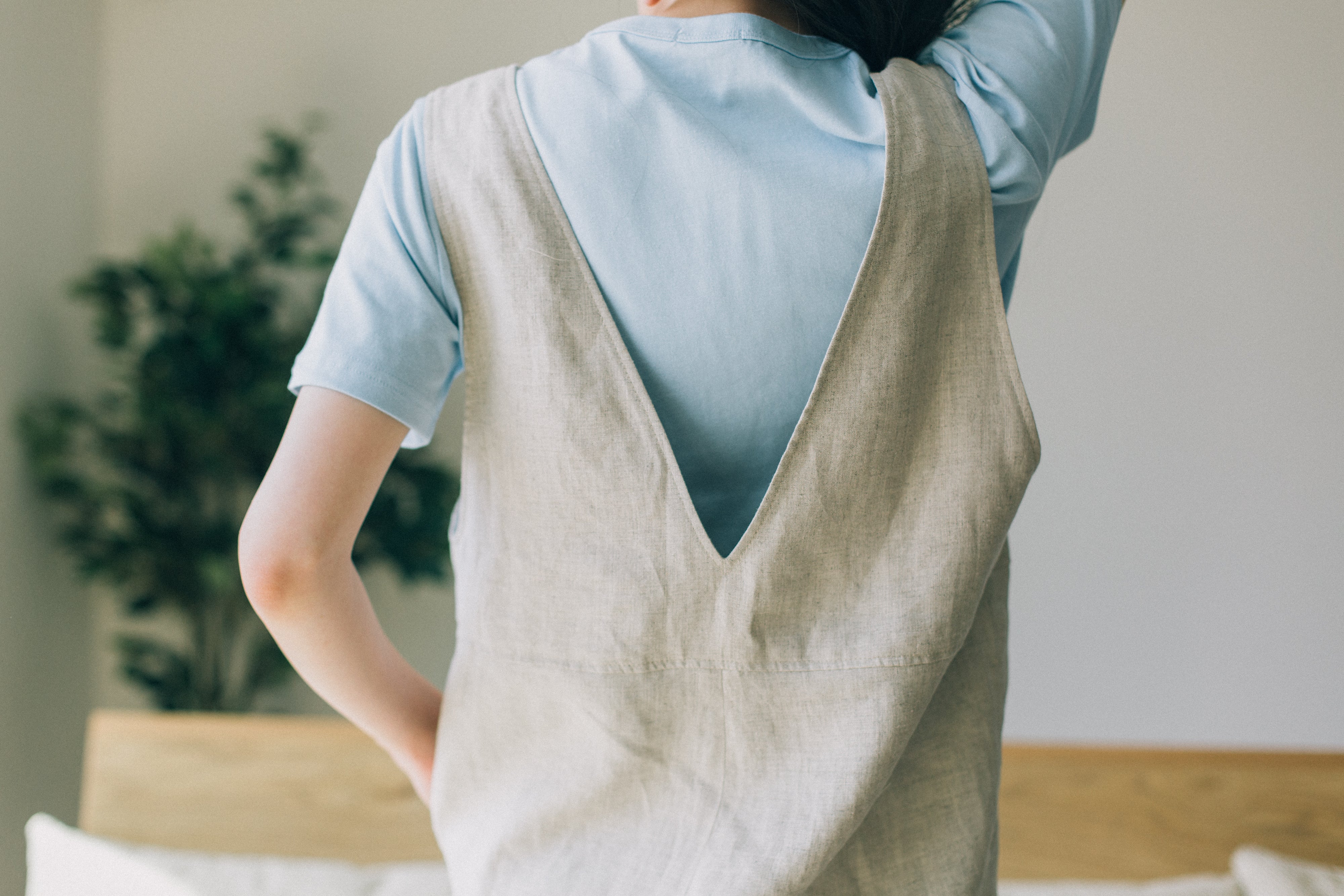 どなたにも「いいね!」と思ってもらえて、どんな動きをしてもストレスを感じることのないものを目指してデザインしたエプロンは、さっとかぶるだけで首に負担がかかりません。