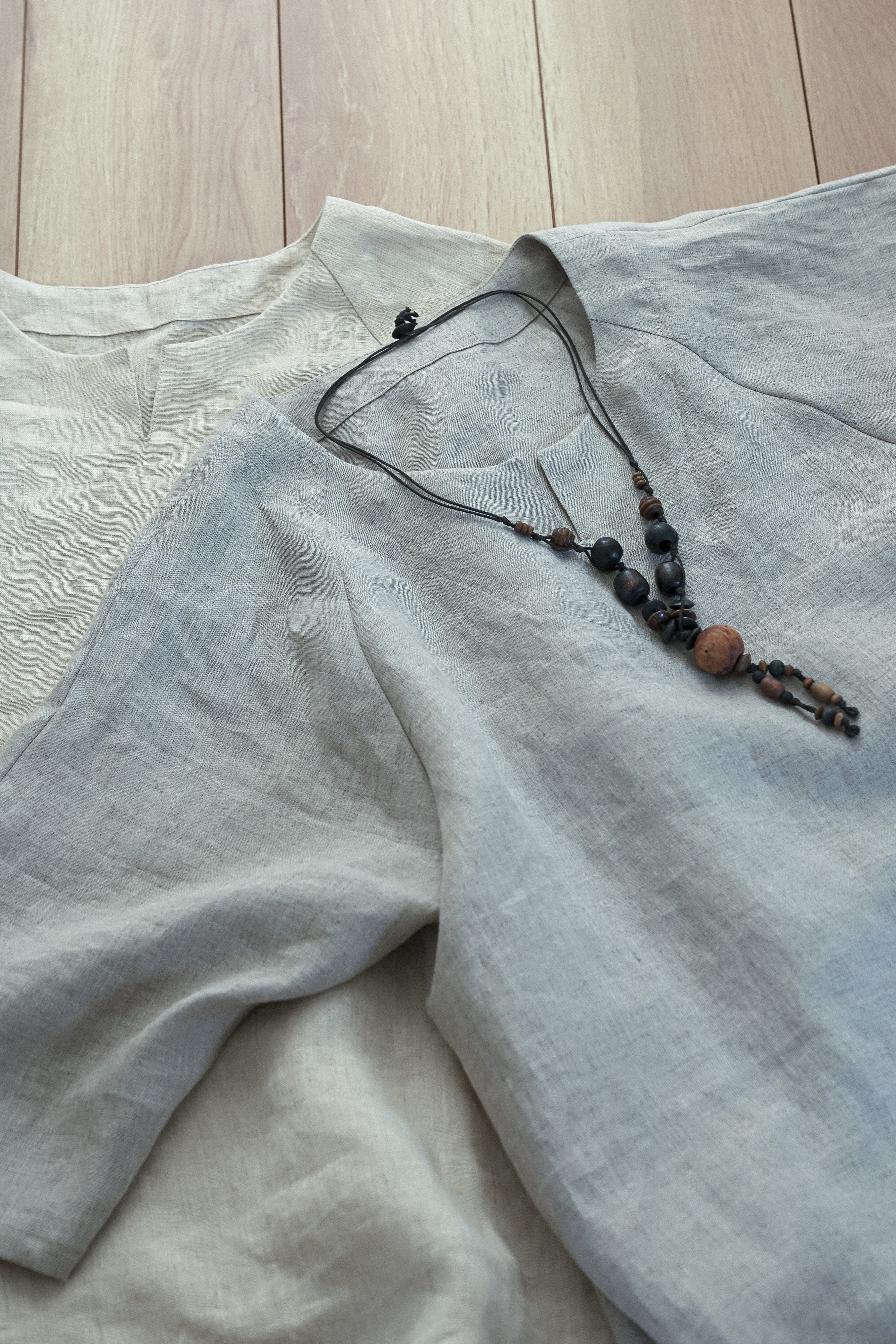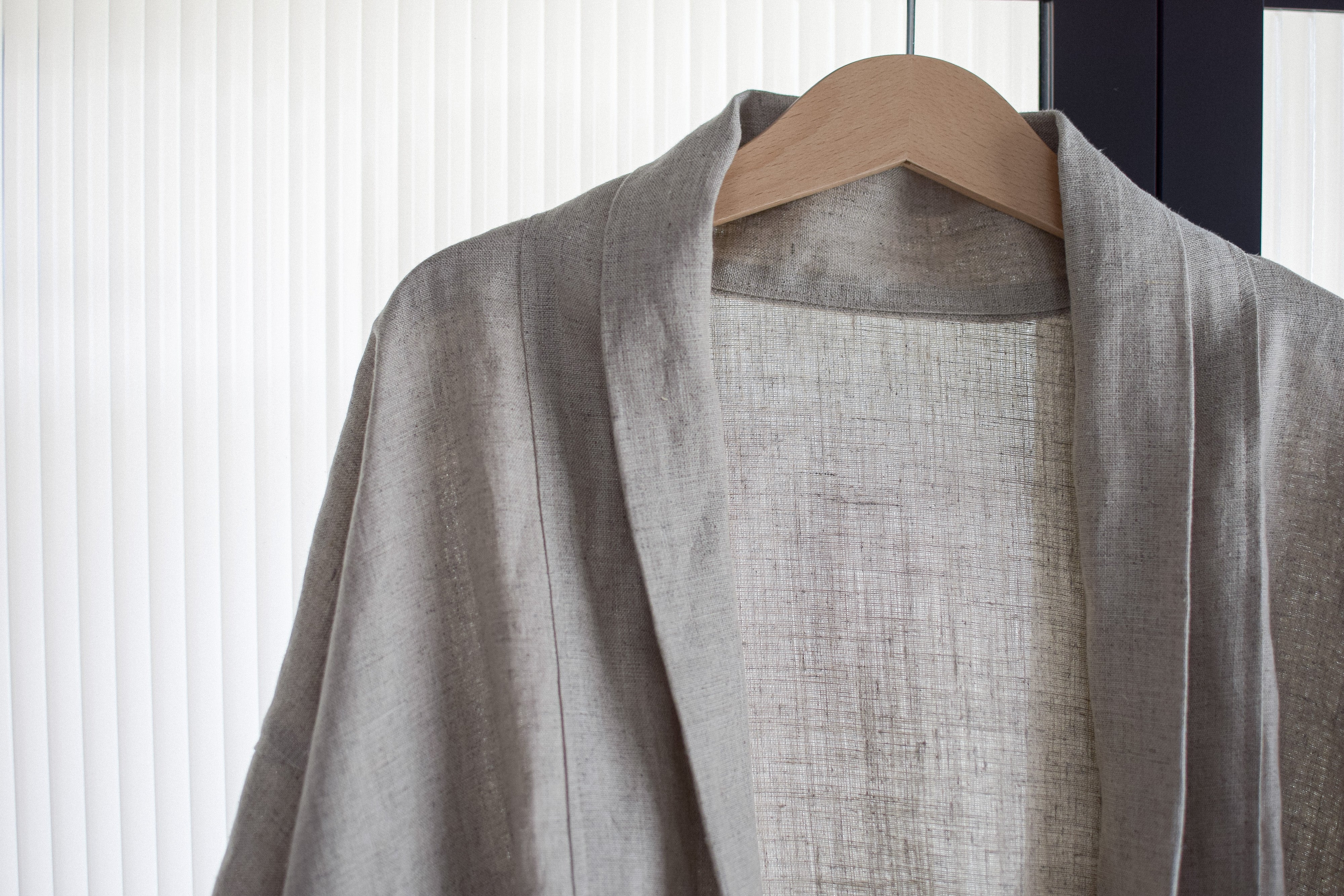ゆったりめですが、折り返しによってできる襟と、合わせの切り替えが、二本の縦ラインを作るため、すっとした印象に。