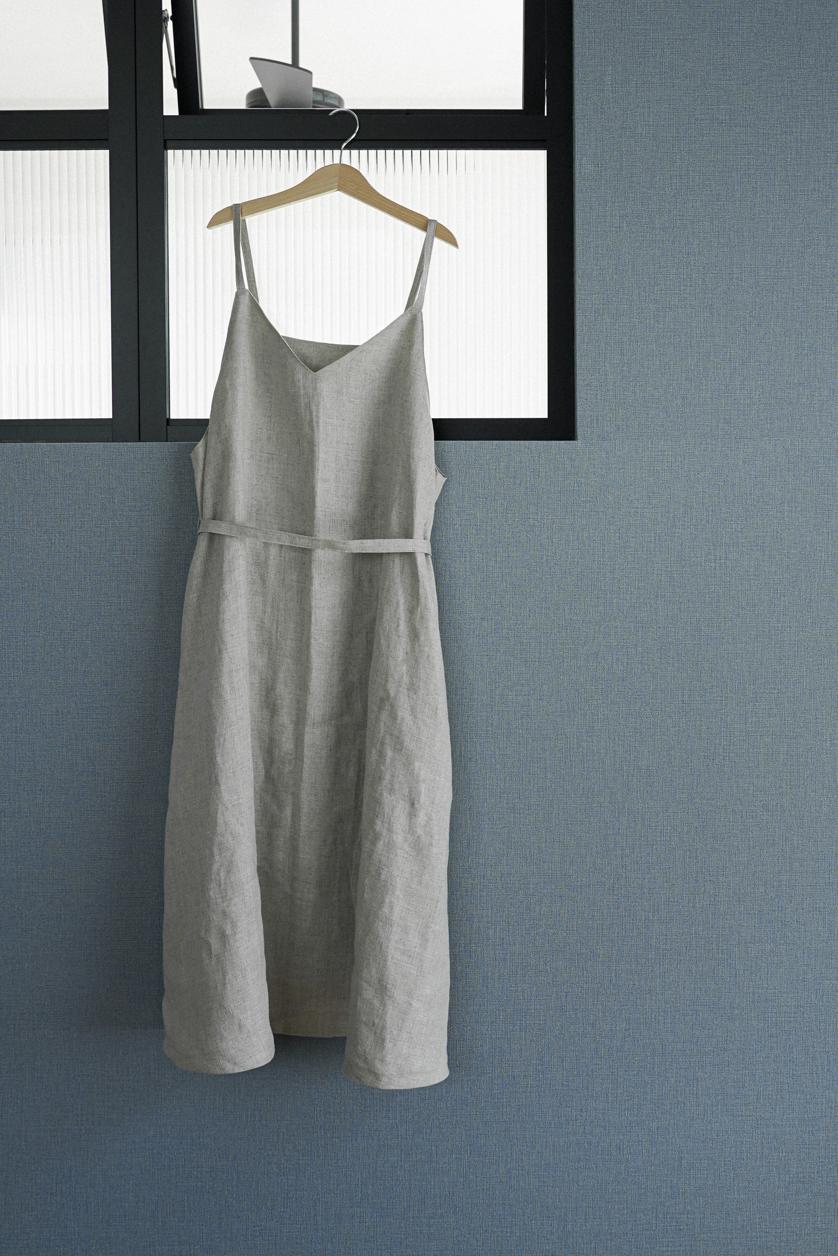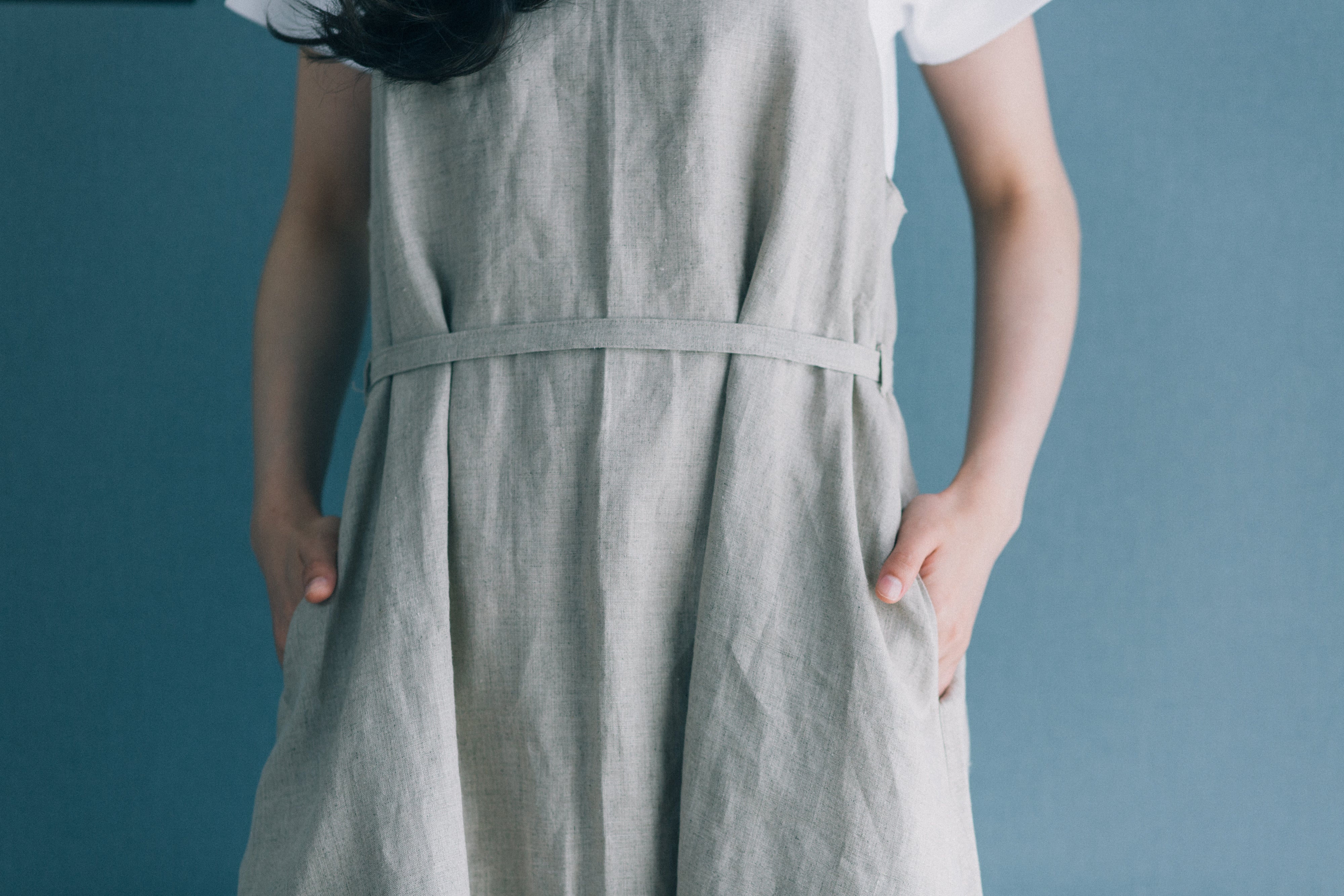 ウエストマークできる布ベルトをはずせば、きれいなAラインシルエットになります。ちょうど良い位置にちょうど良い大きさのポケットが便利。