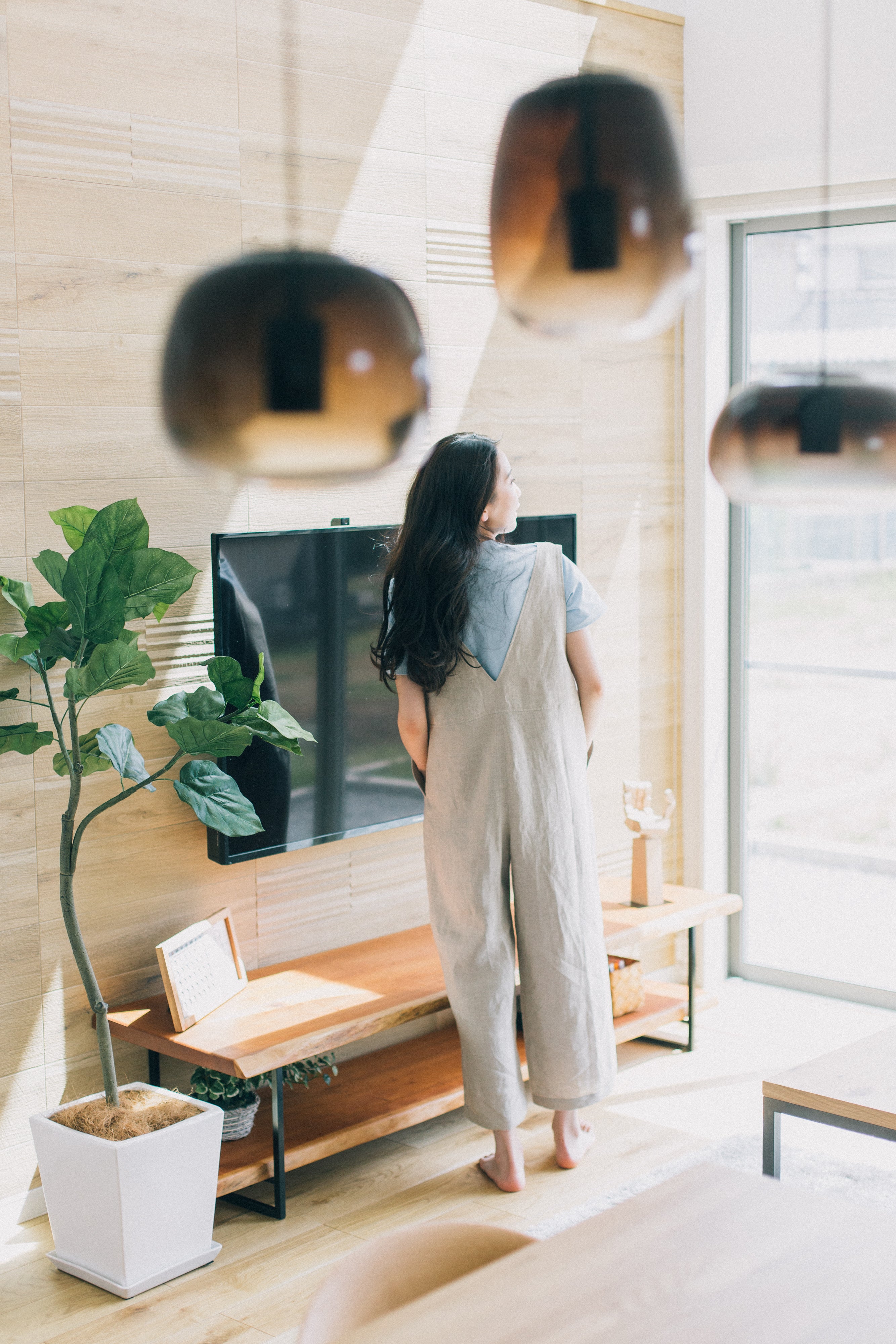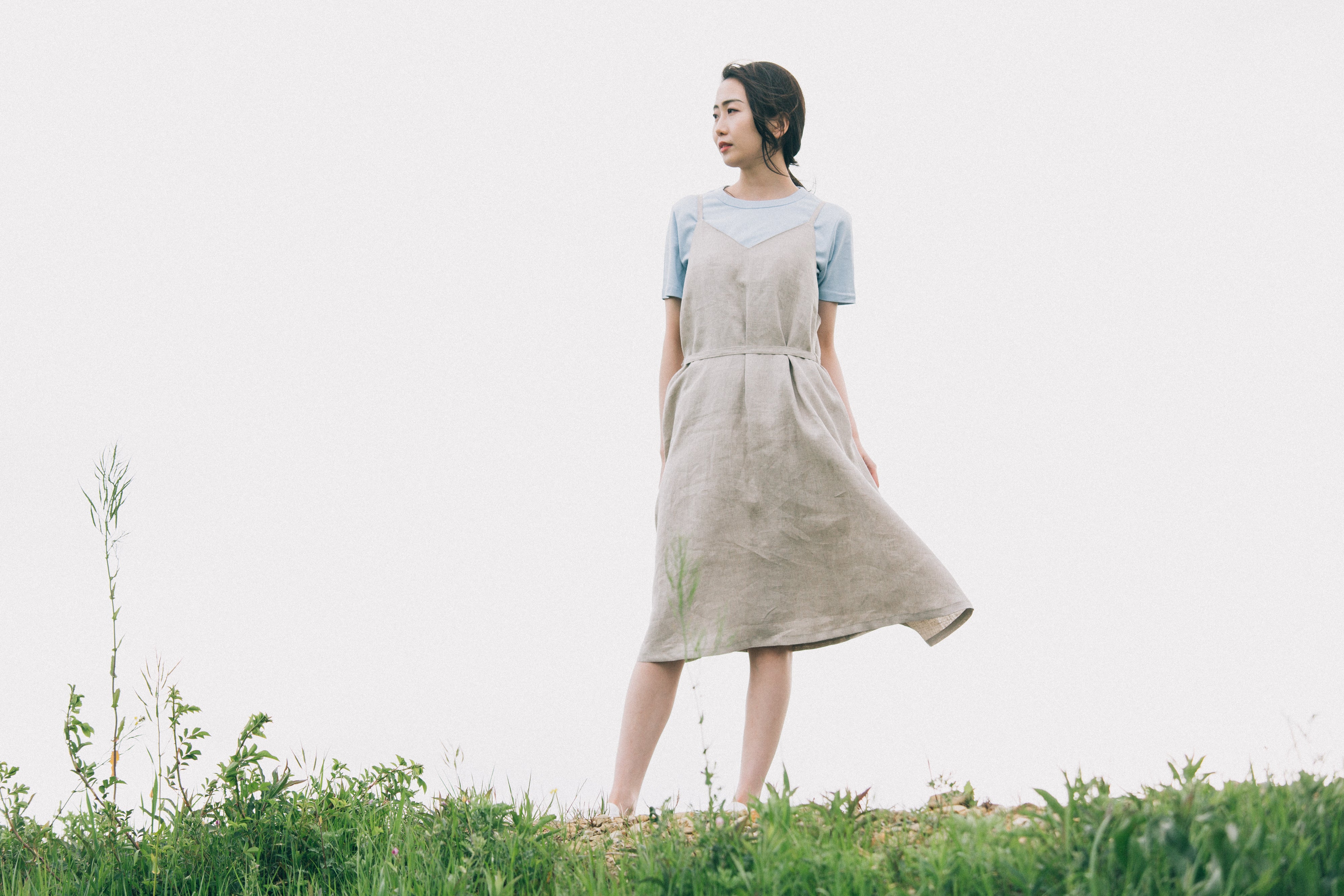 「つなぎ」の可愛さに、ヘンプのnaturalな生地感がクールさをプラス。可愛いイメージの「つなぎ」スタイルですが、シャープに見えるように、前後を大きくV字にカットしました。