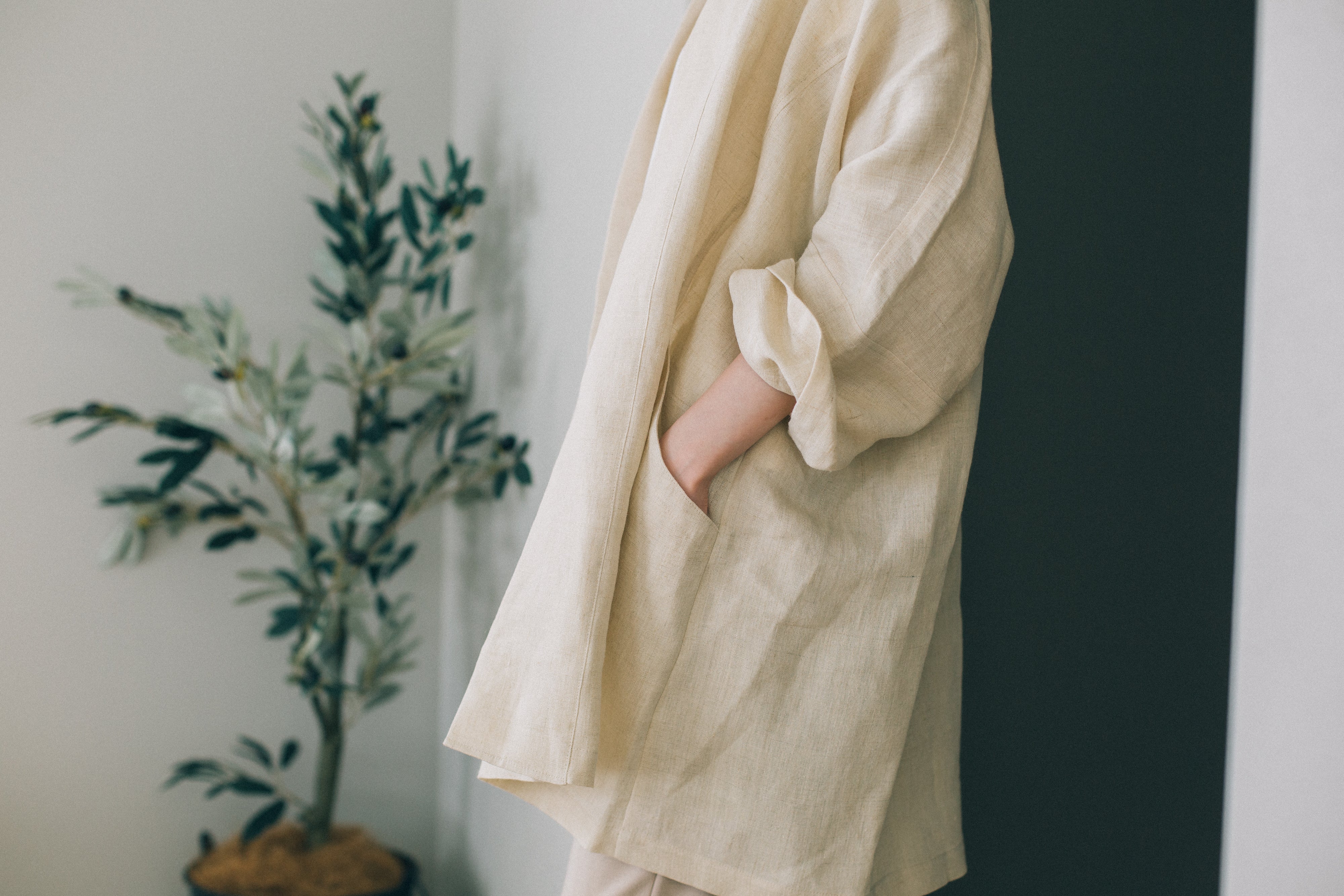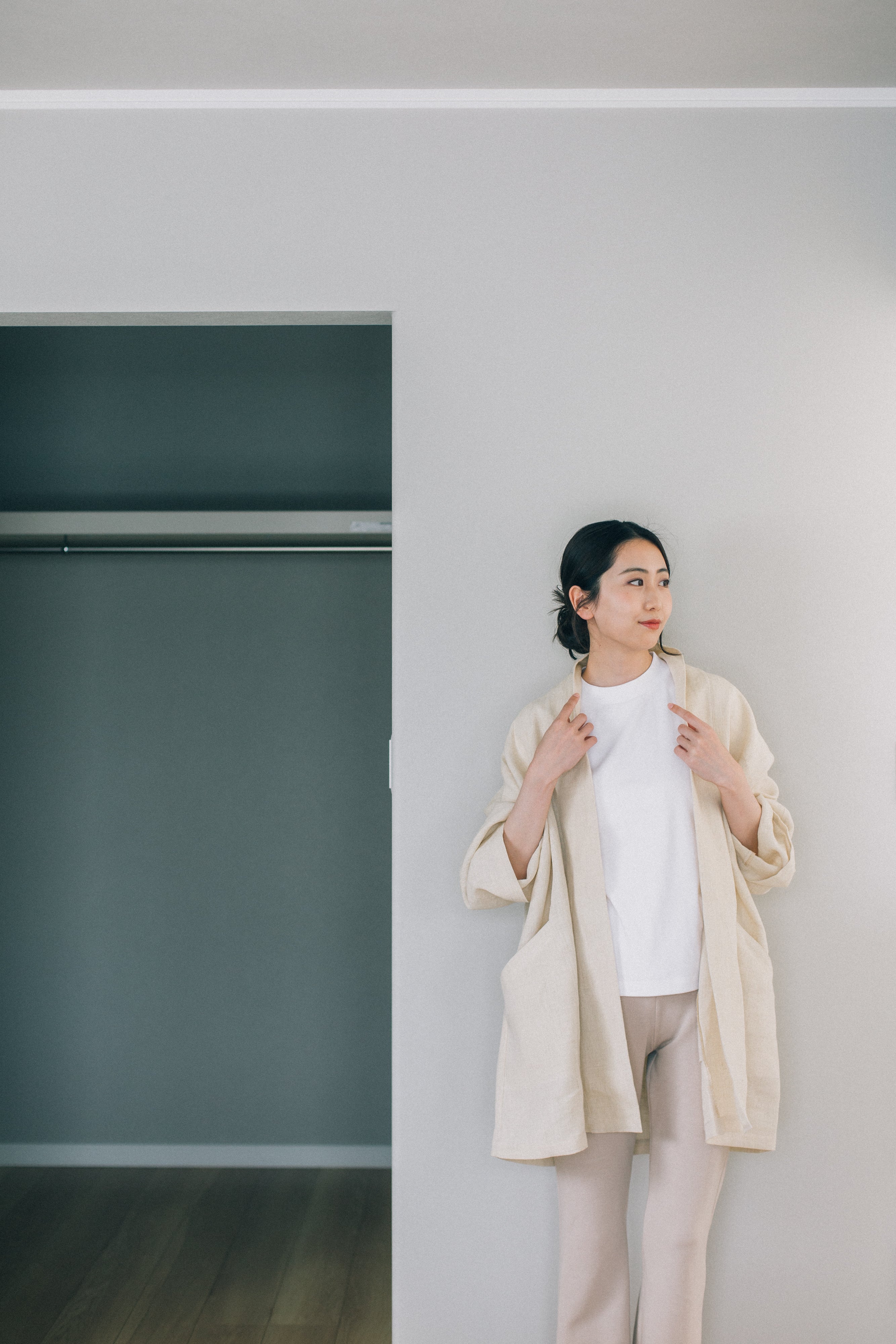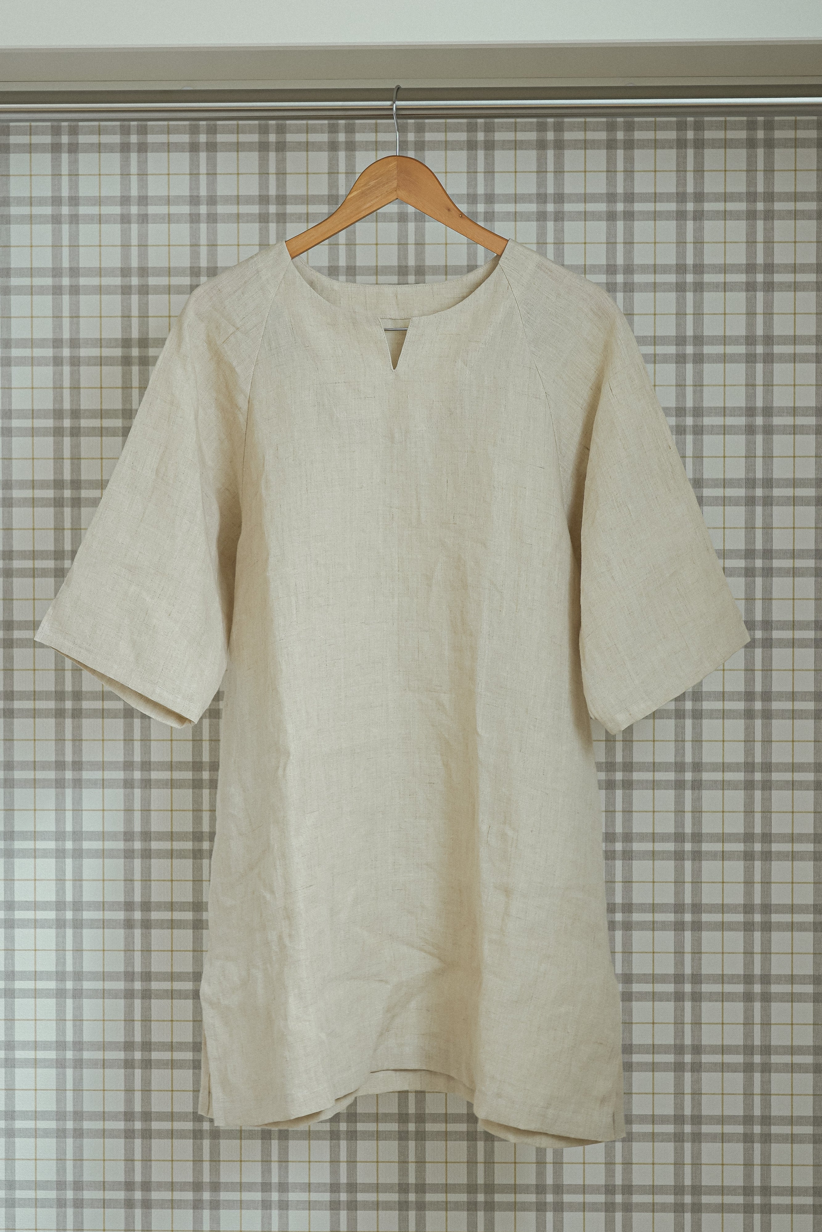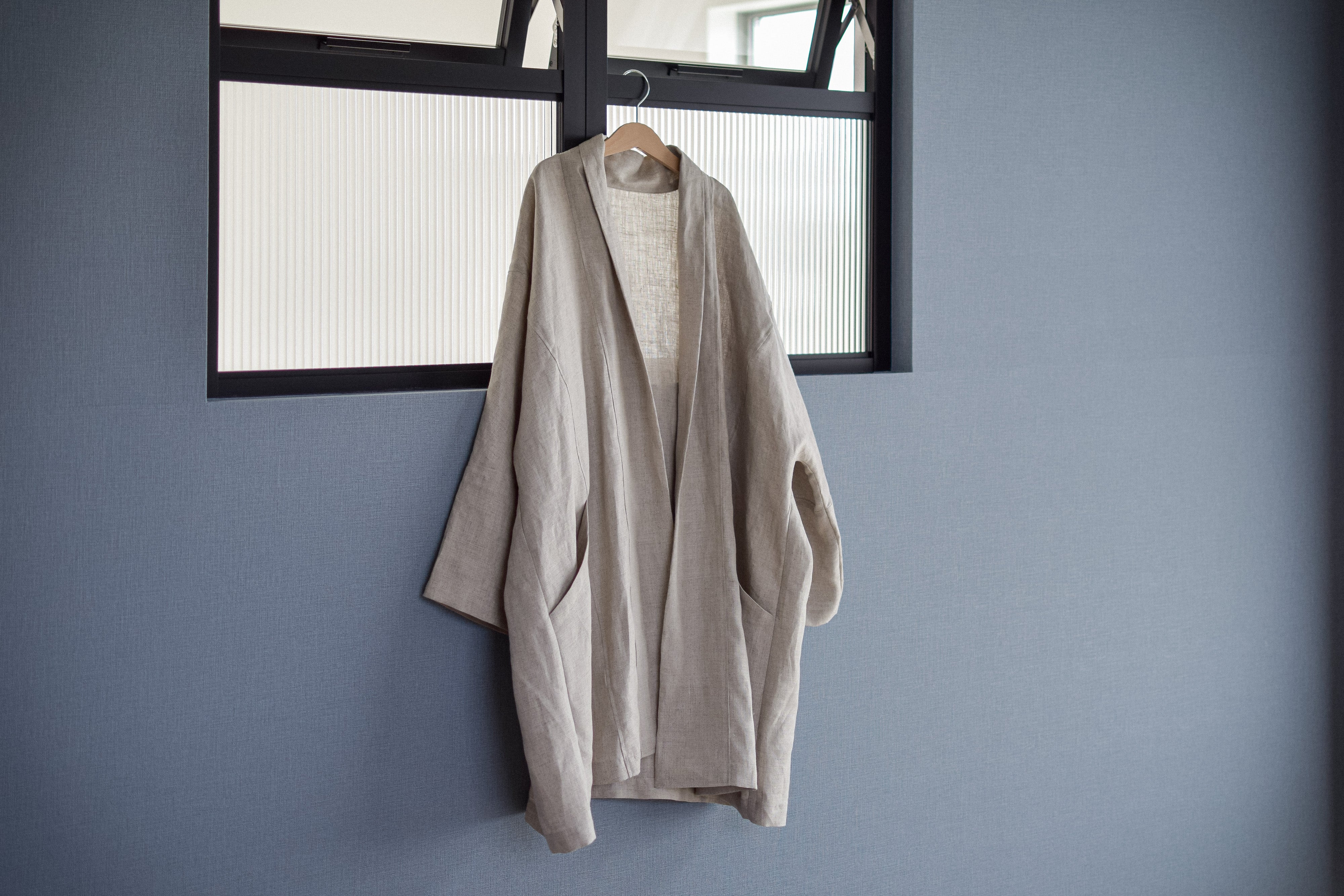 ゆったりめですが、折り返しによってできる襟と、合わせの切り替えが、二本の縦ラインを作るため、すっとした印象に。