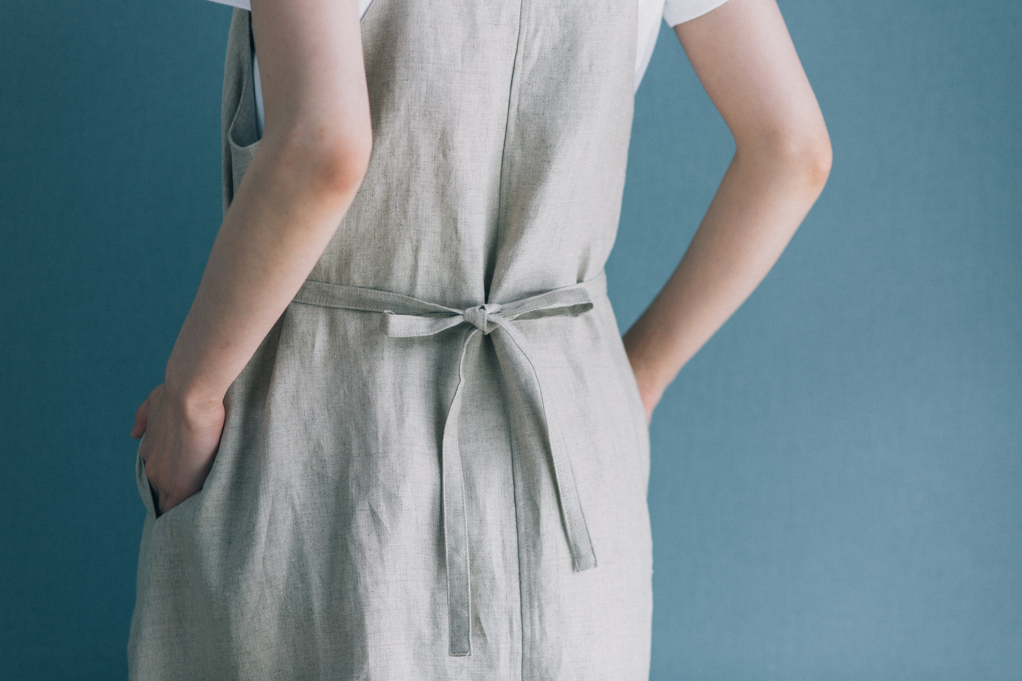 ウエストマークできる布ベルトをはずせば、きれいなAラインシルエットになります。ちょうど良い位置にちょうど良い大きさのポケットが便利。