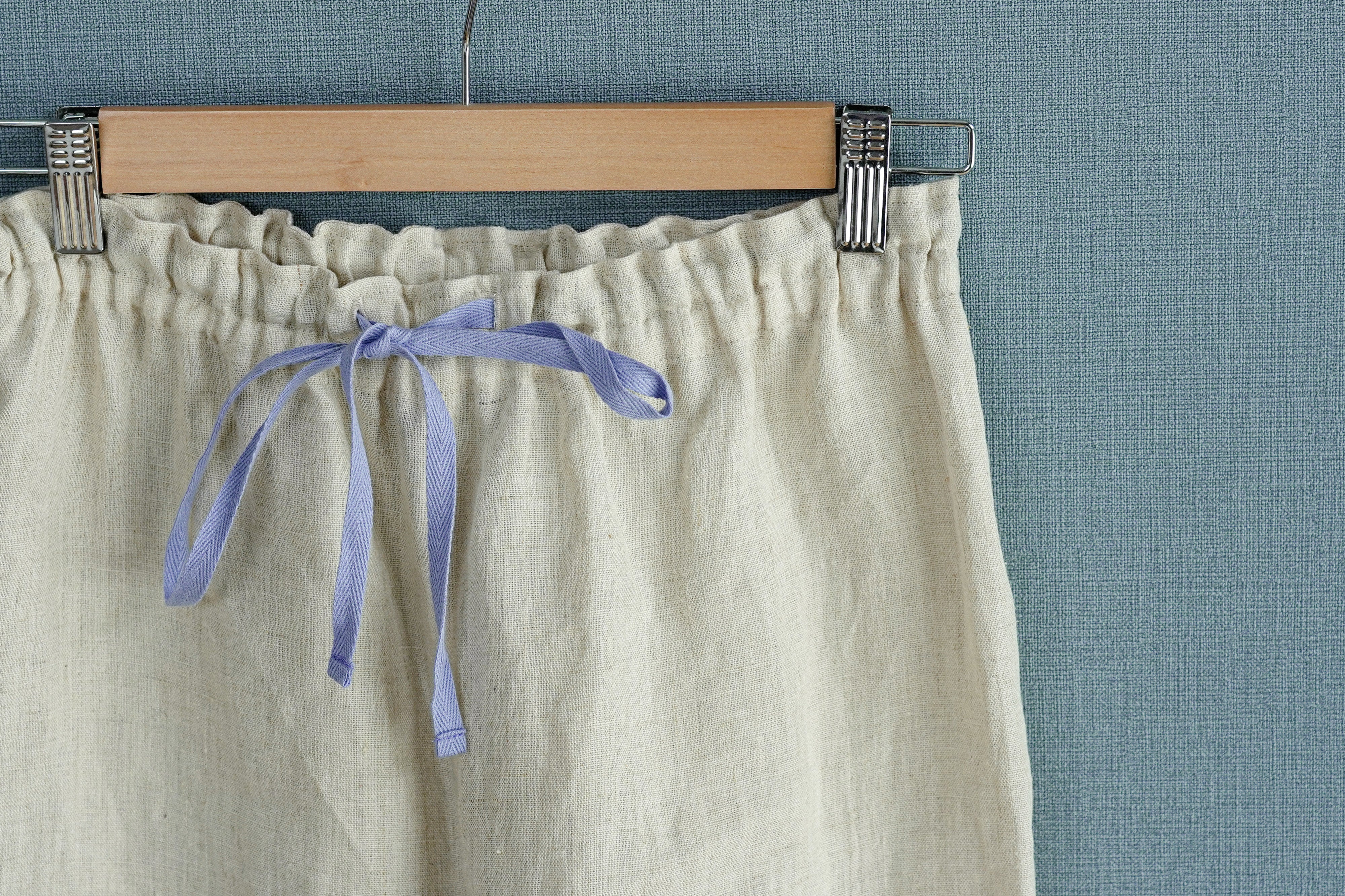 ウエストはゆったりめの3サイズをご用意。2本仕立てのウエストゴムは、クルクルまわってしまったり、ゴロゴロ当たって気になったりしません。サイズ別にきれいなカラーの紐が入っていて、調節できるようになっています。(水色…M 青…L 緑…LL)